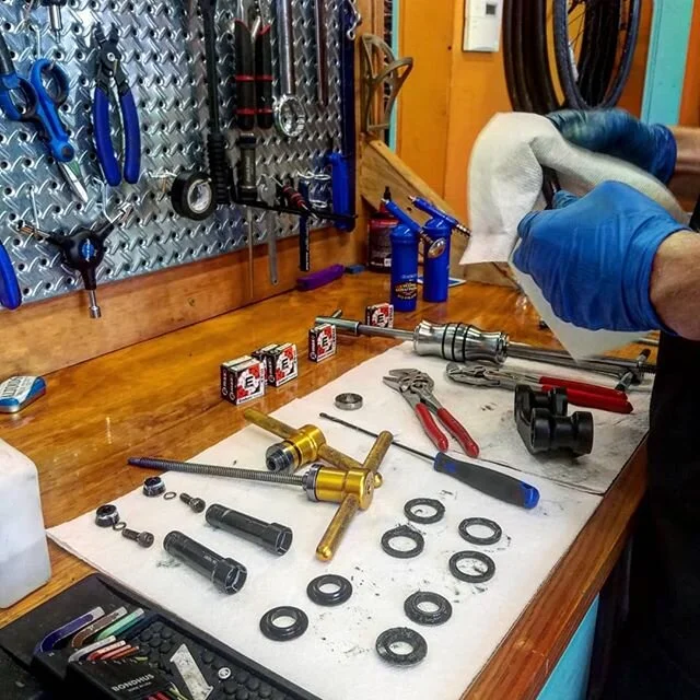 Our bench rate is $120 per hour: this includes odd jobs such as pinpointing “pops and creaks” in bicycles, rebuilds of rare or exotic components, or any other services that require bench time and tools.